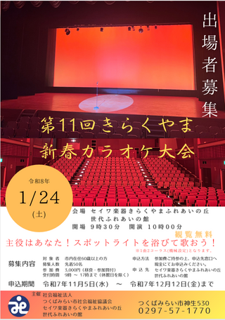 令和8年1月24日(土)開催、第11回きらくやま新春カラオケ大会の申込が、12月...