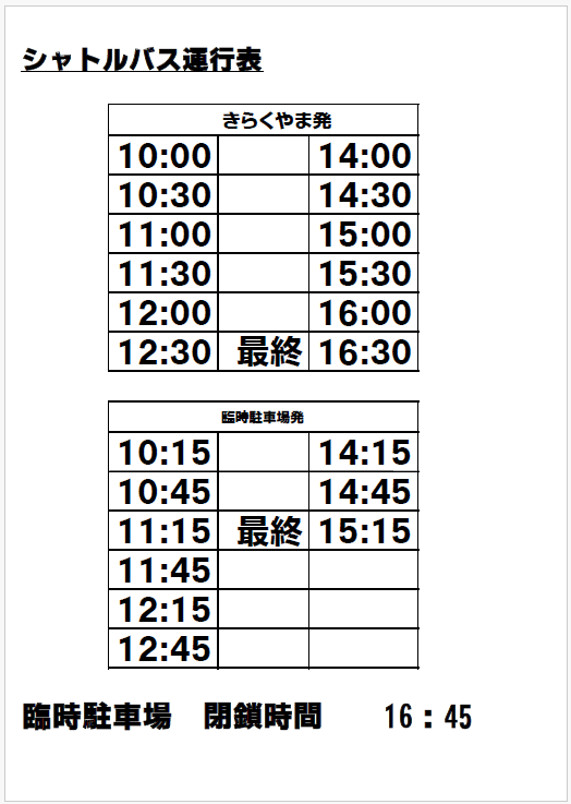 第11回きらくやま桜まつり情報について(出店・キッチンカー・臨時駐車場・シャトルバス運行表) 2026年4月 3日 お知らせ 以下の詳細は、パンフレットのQRコードより情報をご確認いただけます。 出店・キッチンカー情報 臨時駐車場の場所・シャトルバスの運行表 皆様お誘い合わせの上、ぜひご来場ください! ツイート