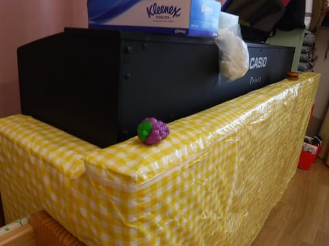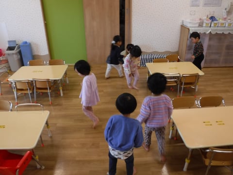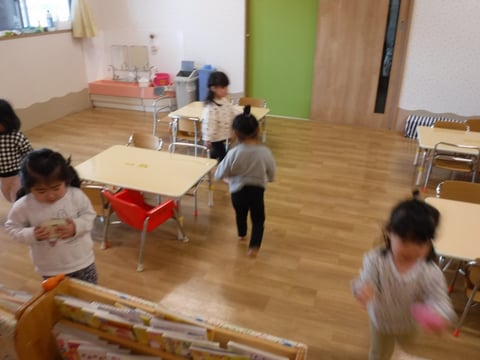 カーテンを閉めて、見えないところで先生がおままごとの食べ物を隠します🍕🍔🍟🥐🍧🍩