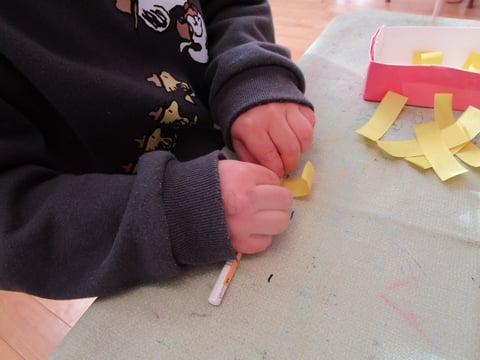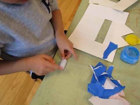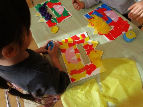 好きな色の折り紙を千切ったり