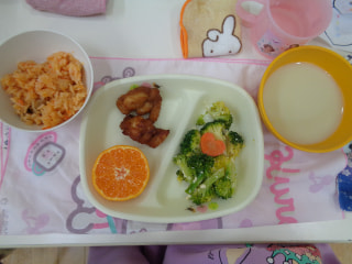 チキンライスにコーンスープ、ブロッコリーのサラダ、みかん