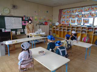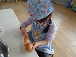 給食の先生のお話を聞いて、まずは、玉ねぎの皮むき🧅