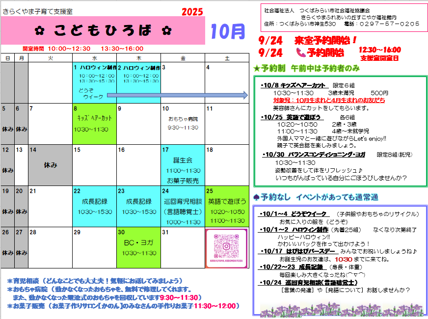『きらくやま 子育て支援室 こどもひろば』10月のお知らせ